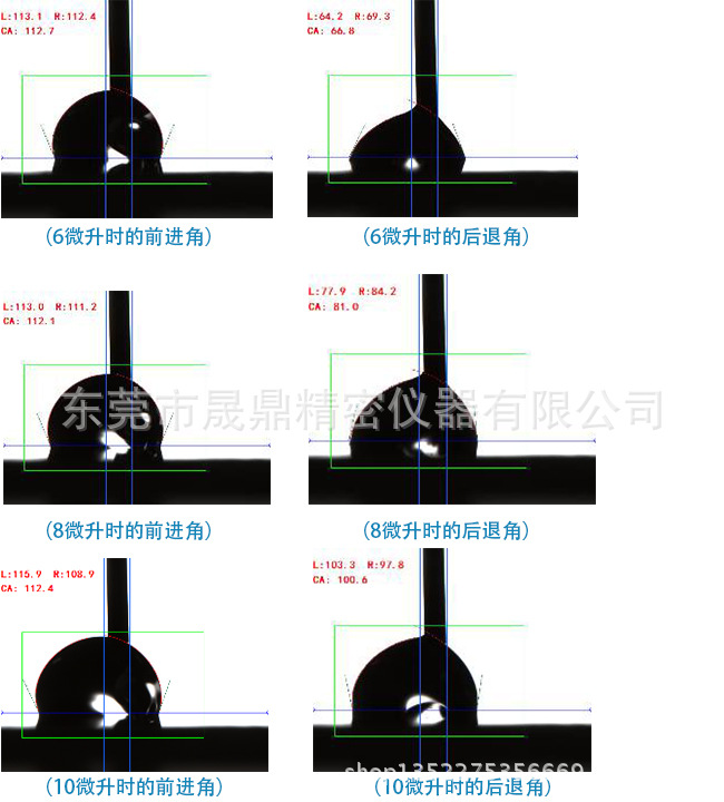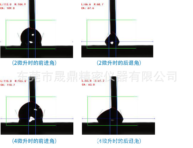 后退角:指液體在已被潤濕過的樣品表面進(jìn)行潤濕鋪展,此時的接觸角叫做樣品的后退角